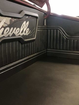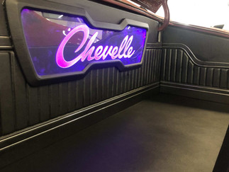 We hand built panels to fit in the trunk and kept the design in line with the factory door panels to make it look more like something GM might’ve done from the factory. The trunk is trimmed in black leather with stainless steel rods inserted throughout the panels just like factory. We wanted to add something a little more new-age though, so we frosted the Chevelle logo into clear acrylic and back lit it with color changing led lights.